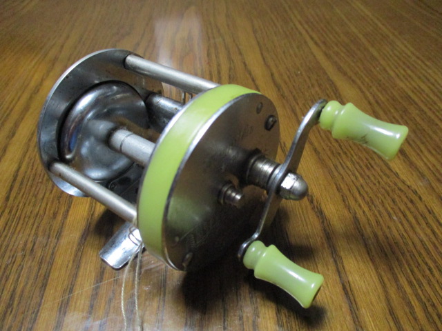 ダイレクトリールは一見丸型のベイトリールに見えますが、今のベイトリールと決定的に異なるのが、「クラッチがない」「ルアーを投げるとハンドルも逆回転する」点です。ダイレクトリールの進化版がベイトリールといった感じでしょうか。「バス釣りにおいては」現在ベイトリールがダイレクトリールの進化版として使われています。これは1950年ごろのリールになります。アルミを多用しているので非常に軽く、扱いやすいリールです。ご覧の通りクラッチとドラグがありません。この、「クラッチとドラグがない」ことがダイレクトリールの最大の特徴になります。リールのクラッチとドラグの仕組みそのものは既に存在していました。特許も関係していると思いますが、当時はまだ普及しておりませんでした。ダイレクトリールがベイトキャスティングリールのスタンダードだったんですね。クラッチとドラグが付いたベイトキャスティングリールが最初に爆発的にヒットしたのは1952〜3年からです。